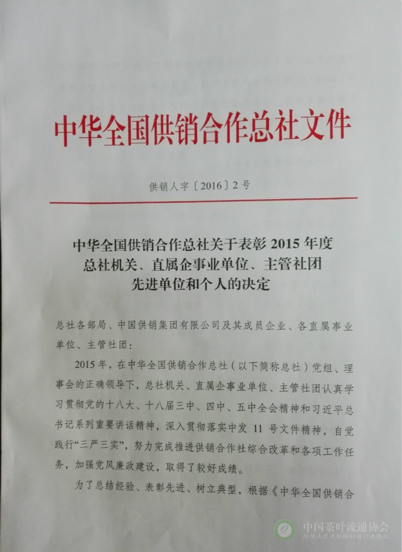 2016年1月17日,中华全国供销合作总社召开2015年度工作总结会,中国茶叶流通协会荣获“2015年度综合考核先进集体”称号,中茶协常务副会长王庆同志荣获“2015年度先进个人”称号,并受到表彰。