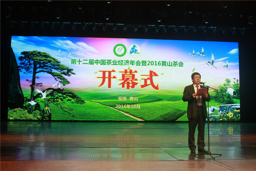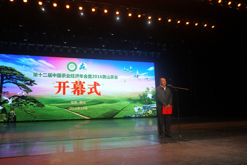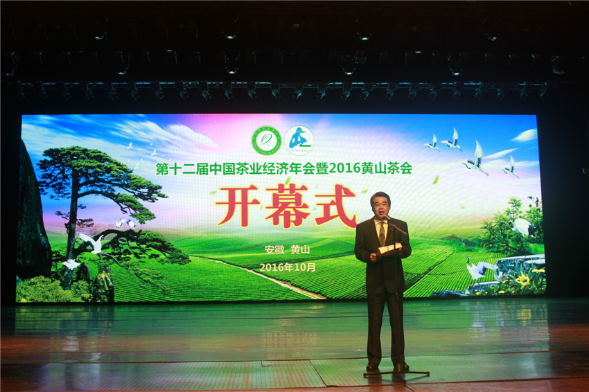 开幕式由黄山市委副书记、市长孔晓宏主持,中华全国供销合作总社党组成员、理事会副主任肖仲凯,安徽省农委主任孙正东,黄山市委书记任泽锋分别致辞。各位领导对本届年会的成功召开表示祝贺,对中国茶叶经济取得的成就给予高度评价,对黄山茶产业、安徽茶产业以及中国茶产业的发展给予厚望,并鼓励与会的茶叶界同仁在党和政府的正确指引下,团结一致、锐意进取、深化改革、真抓实干、开拓创新、继往开来,为重振中国茶产业的辉煌而努力奋斗。随后,第十届、十一届全国政协副主席白立忱宣布第十二届中国茶业经济年会正式开幕。开幕式上,中国茶叶流通协会对2016年度中国茶业十大领军企业、中国茶业优秀企业品牌、中国茶业十佳成长型企业及中国十大生态产茶县、中国最美茶乡和行业年度人物、茶业发展示范县进行了行业表彰。白立忱副主席代表中国茶叶流通协会向黄山市政府授予“中国名茶之都”牌匾。
