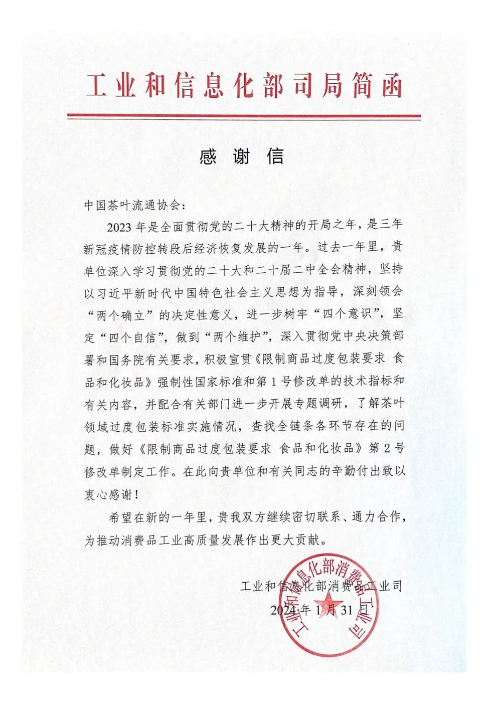 近日,工业和信息化部致函感谢中国茶叶流通协会,对我会在《限制商品过度包装要求 食品和化妆品》强制性国家标准和1号修改单行业技术指标宣贯、专题调研和标准实施追踪等方面所做的相关工作表示肯定,对我会规范茶叶行业的产品包装、推进绿色生产和消费理念的普及做出的贡献表示感谢。