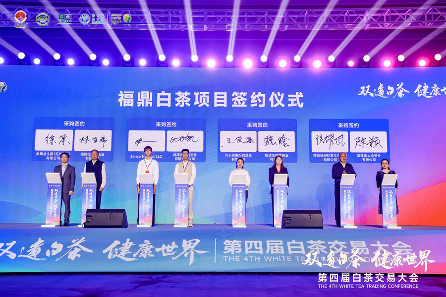 会上,中茶协副会长单位福建省天湖茶业有限公司、福建品品香茶业有限公司、福建鼎白茶业有限公司等福鼎茶企的代表登台推介白茶品牌。在签约环节,绿雪芽、奇古枝、大沁、瑞达等多个福鼎白茶品牌与外地采购方签订购销协议,现场成交总额约2.3亿元。