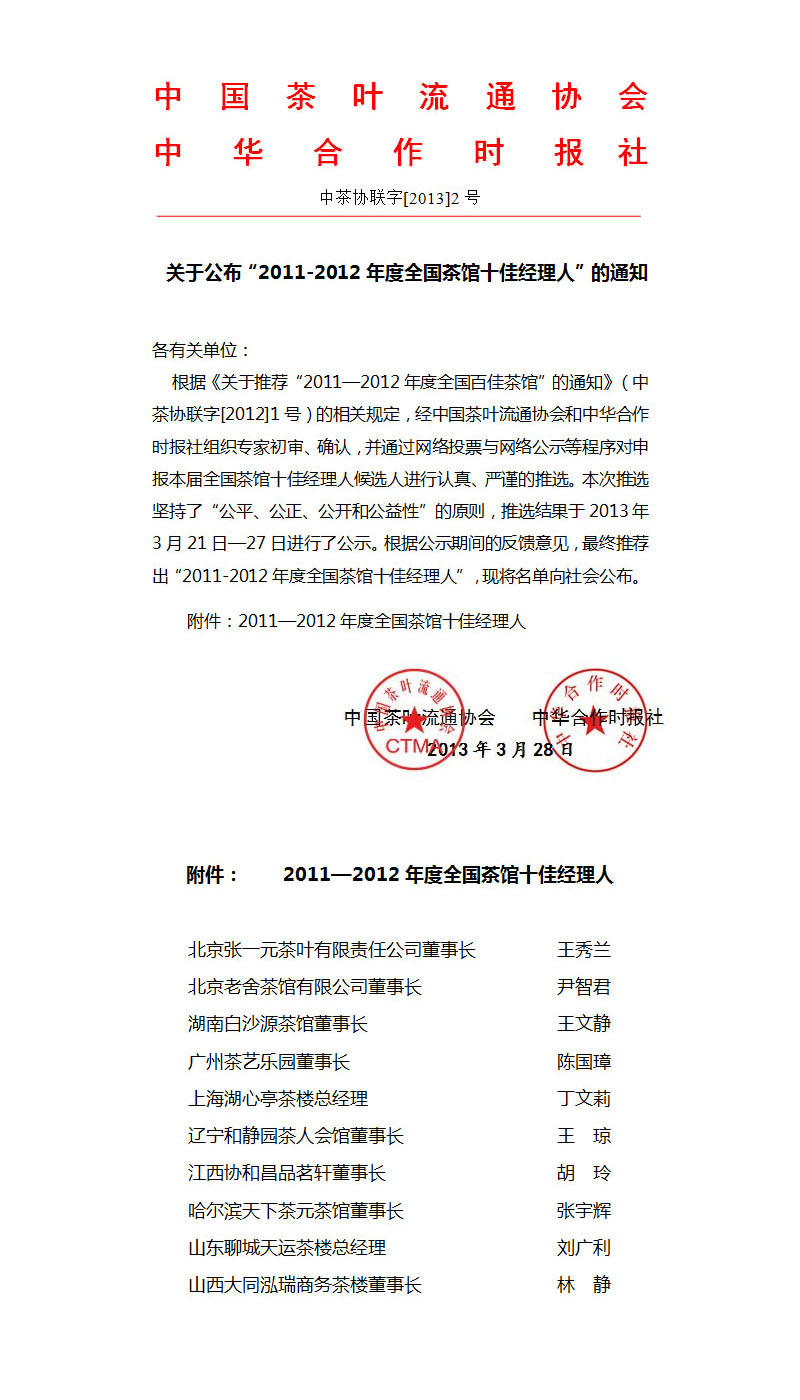 关于公布“2011-2012年度全国茶馆十佳经理人”的通知