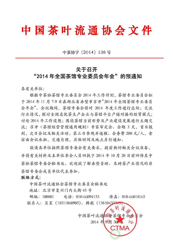 关于召开“2014年全国茶馆专业委员会年会”的预通知