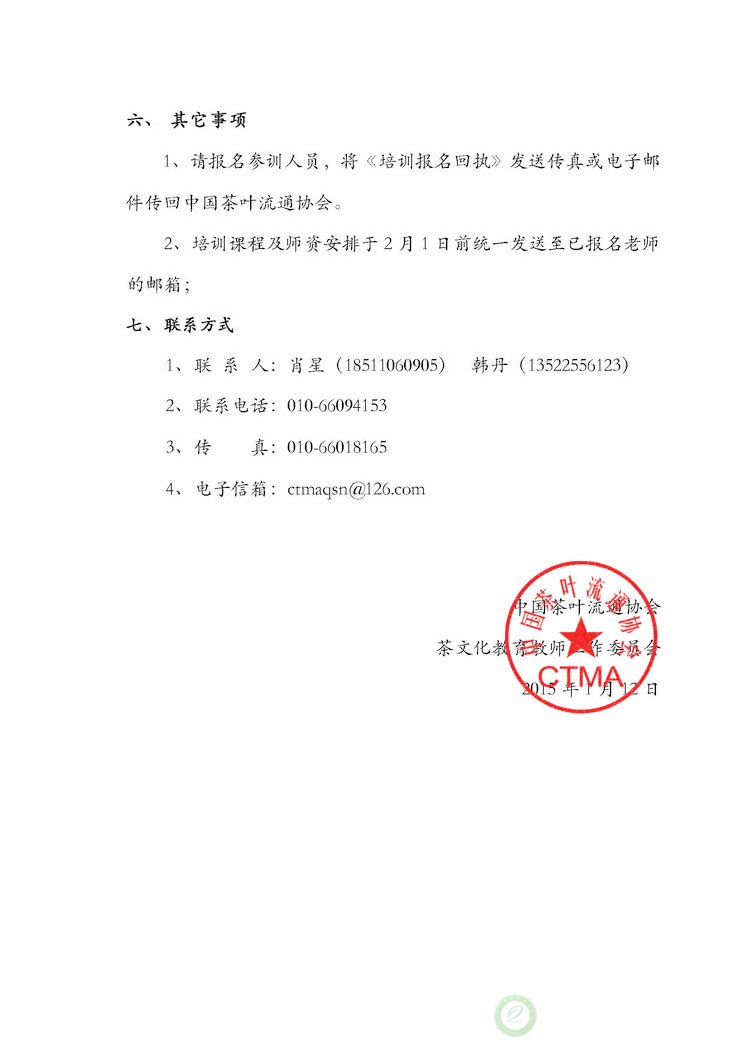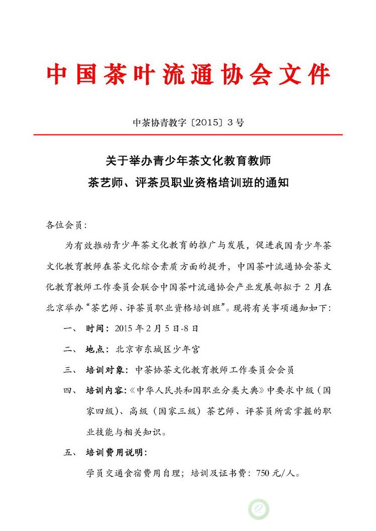 关于举办青少年茶文化教育教师茶艺师、评茶员职业资格培训班的通知
