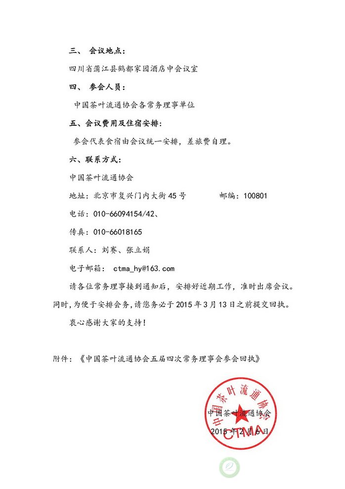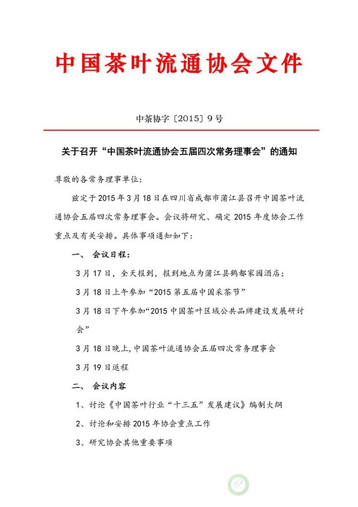 关于召开“中国茶叶流通协会五届四次常务理事会”的通知