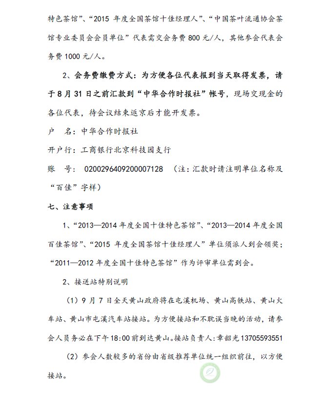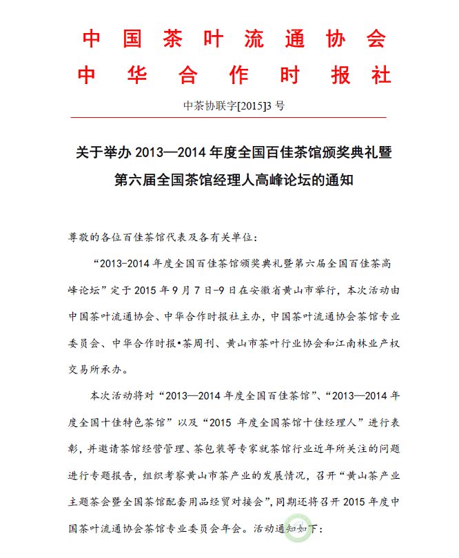 关于举办2013—2014年度全国百佳茶馆颁奖典礼暨 第六届全国茶馆经理人高峰论坛的通知