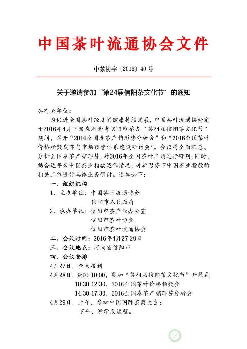 关于邀请参加“第24届信阳茶文化节”的通知