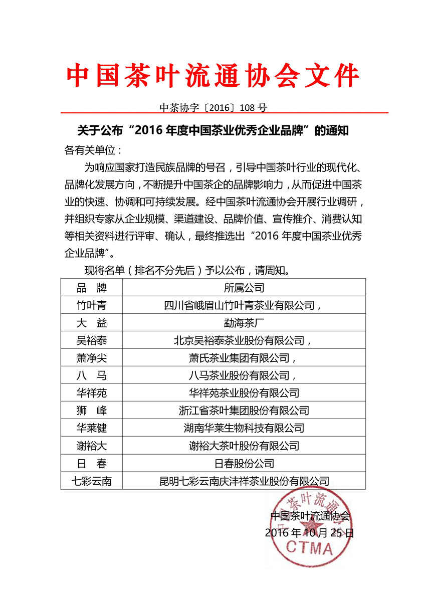关于公布“2016年度中国茶业优秀企业品牌”的通知