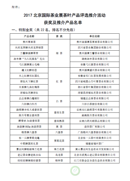 关于公布2017北京国际茶业展茶叶产品评选推介活动获奖及推介产品名单的通知