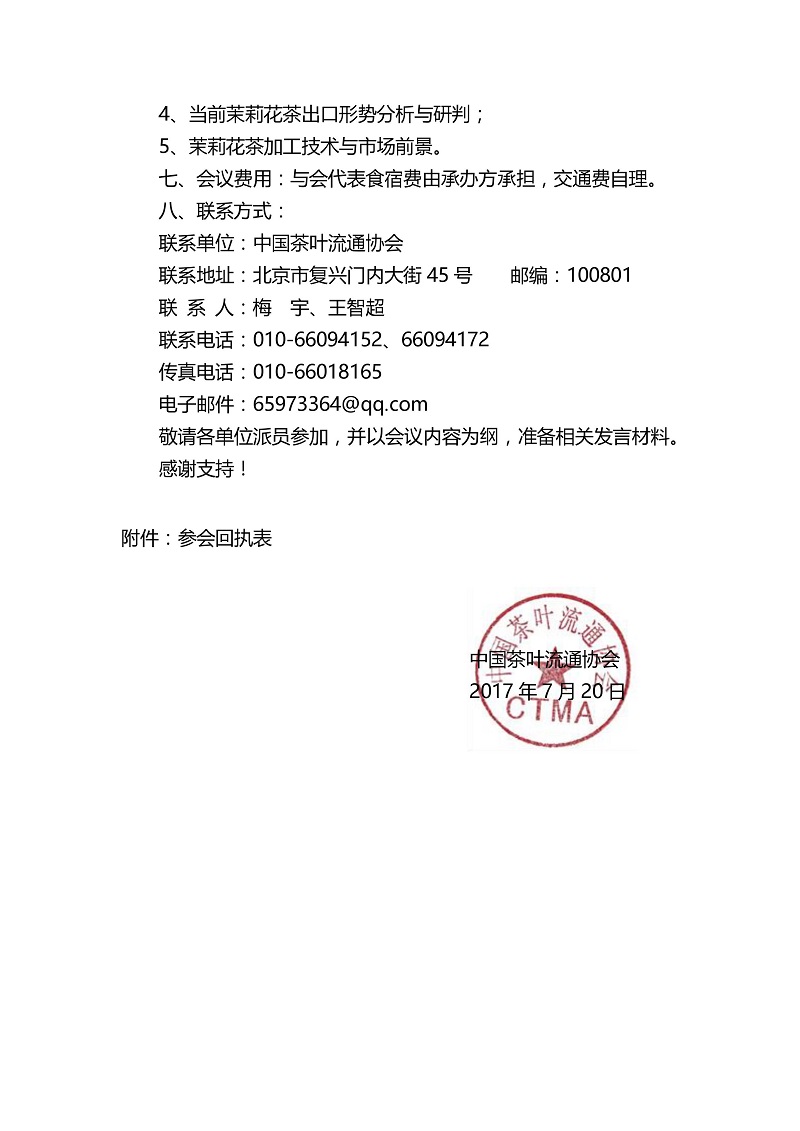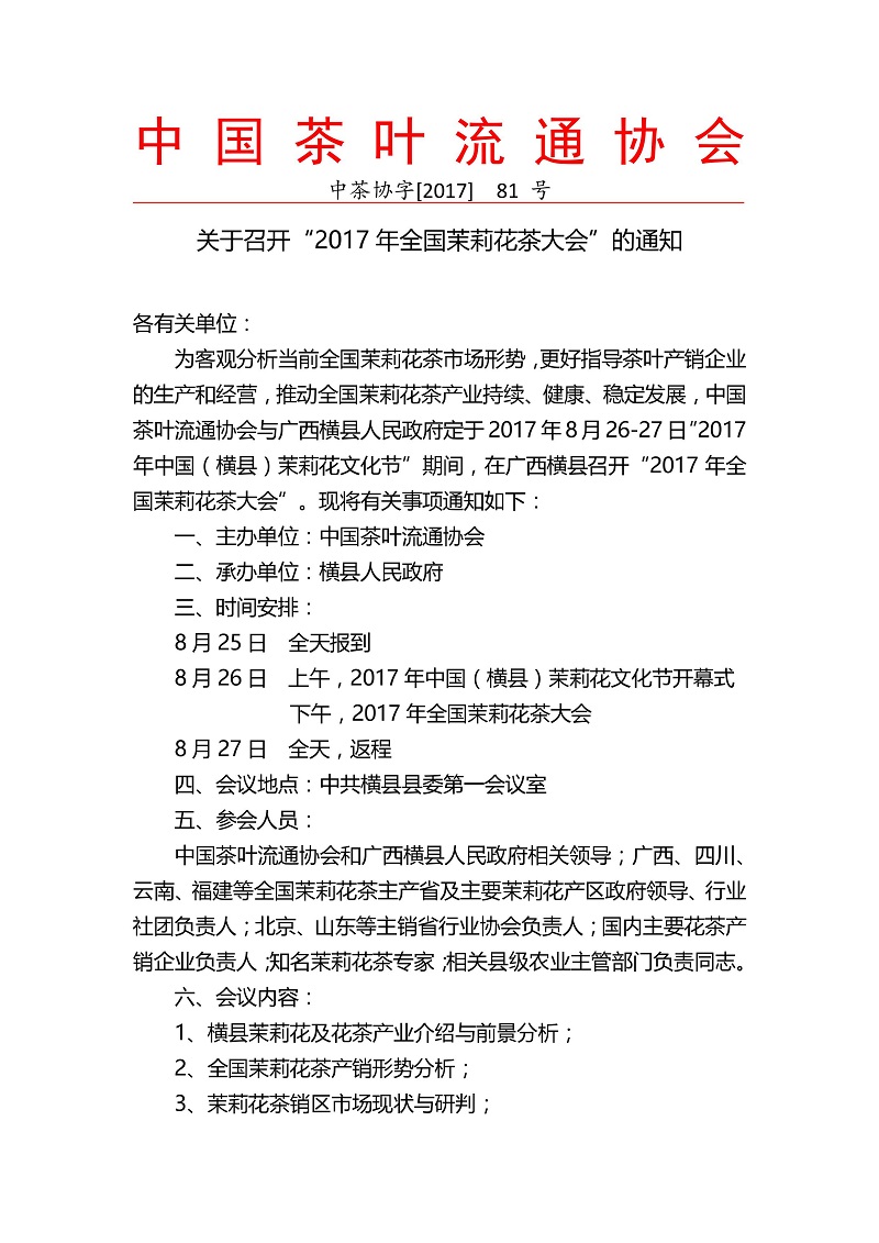 关于召开“2017年全国茉莉花茶大会”的通知