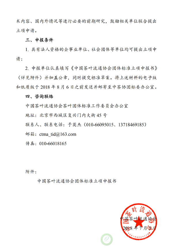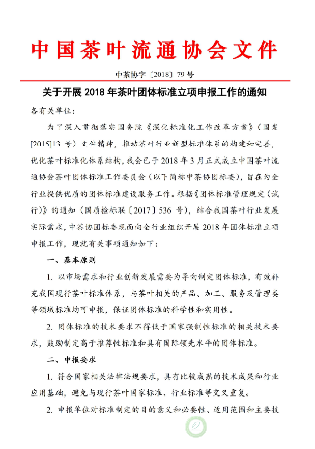 关于开展2018年茶叶团体标准立项申报工作的通知