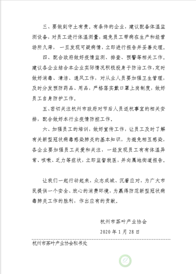 疫情就是命令!新型冠状病毒肺炎疫情发生后,根据中共杭州市委和杭州市人民政府的要求,杭州市民政局对新型冠状病毒感染的肺炎疫情防控工作所进行的全面部署,中国茶叶流通协会副监事长、杭州市茶叶产业协会会长张一民,以杭州市茶叶产业协会名义发布了《关于新型冠状病毒肺炎疫情防控倡议书》。号召会员企业在思想上高度重视,加强疫情防范,配合政府做好疫情监测、排查、预警等相关工作,众志成城,合力抗击疫情,为赢得防范新型冠状病毒肺炎工作的胜利,作出应有的贡献。