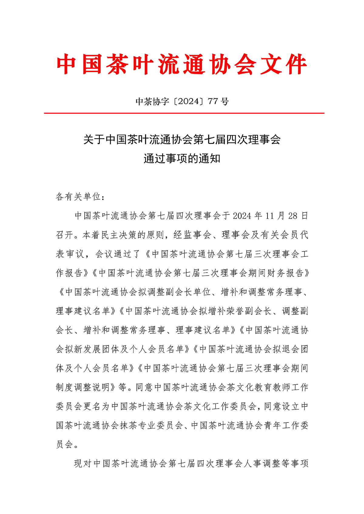 关于中国茶叶流通协会第七届四次理事会通过事项的通知