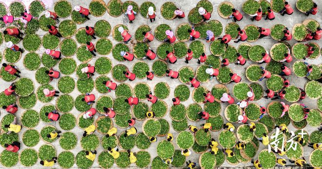 凤凰山脉的坪坑头村,是当下网红爆款茶叶“鸭屎香”的原产地。千庭茶业的采茶工们头戴斗笠,或挎竹篮,或背竹篓,穿梭在整齐排列的茶树间,一捏,一掐,娴熟地采摘着单丛新叶。春茶采摘下来后,将进行晒青、晾青、做青、杀青、揉捻、烘焙等制作工序,最终成为成品茶流向市场。