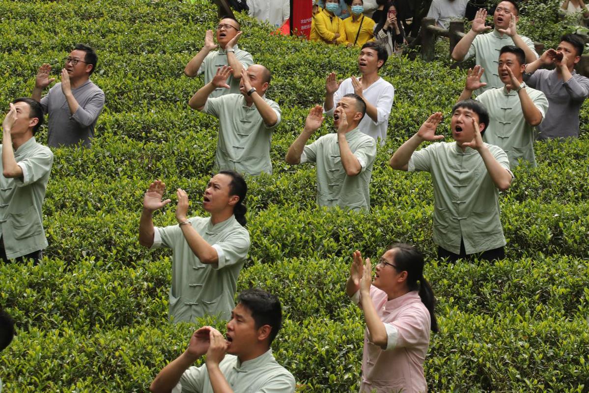 4月13日,武夷山茶人在九龙窠大红袍母树下绿色生态茶园呼喊“采茶咯!茶叶丰收咯!”。(邱汝泉 摄)