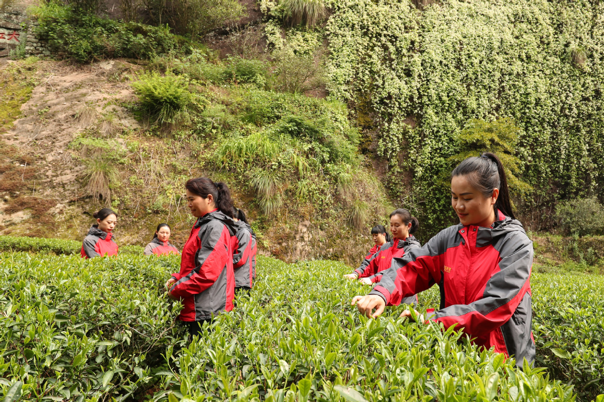 4月13日,武夷山青年茶人在九龙窠大红袍母树下绿色生态茶园采茶。(邱汝泉 摄)