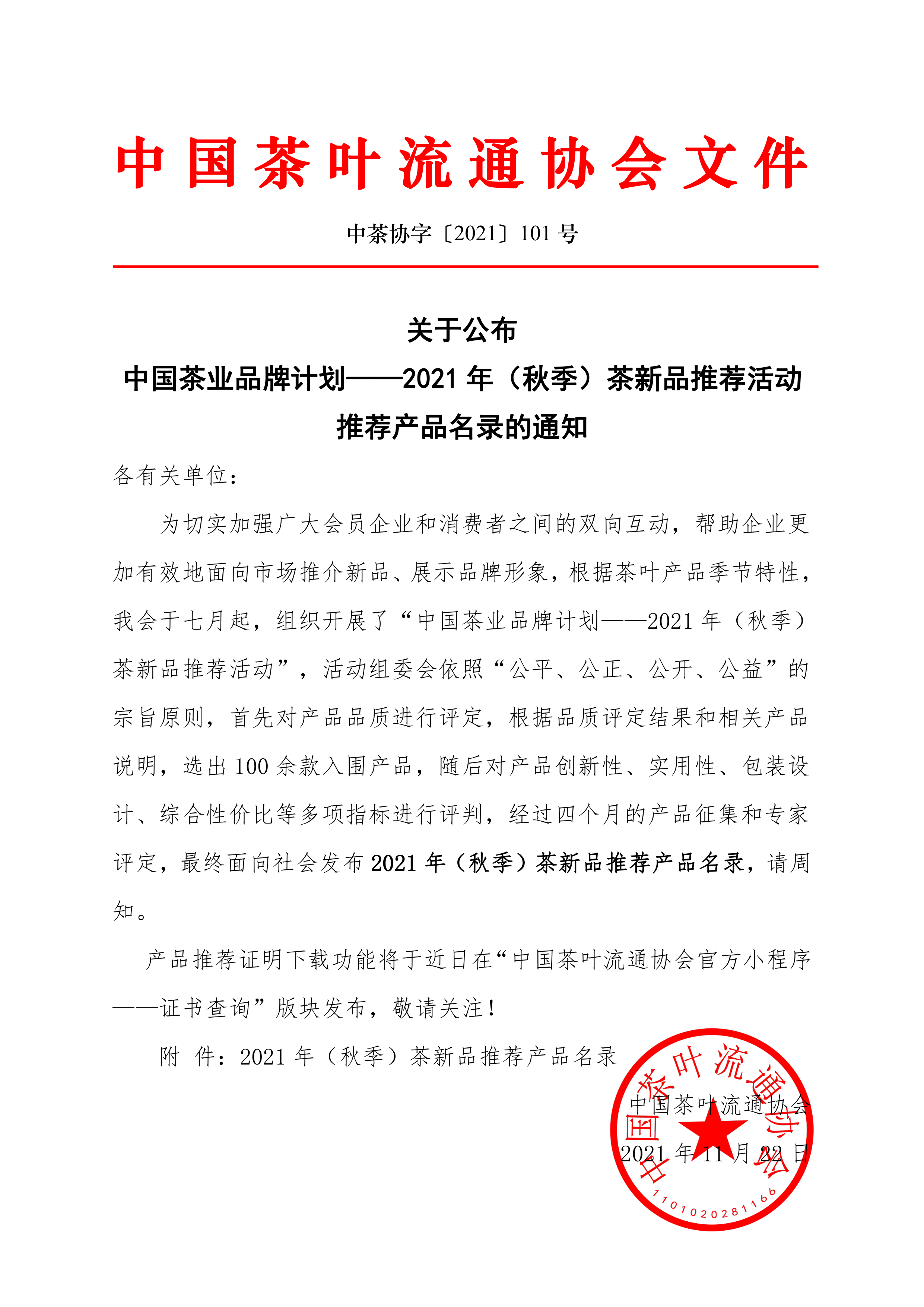 关于公布中国茶业品牌计划——2021年(秋季)茶新品推荐活动推荐产品名录的通知