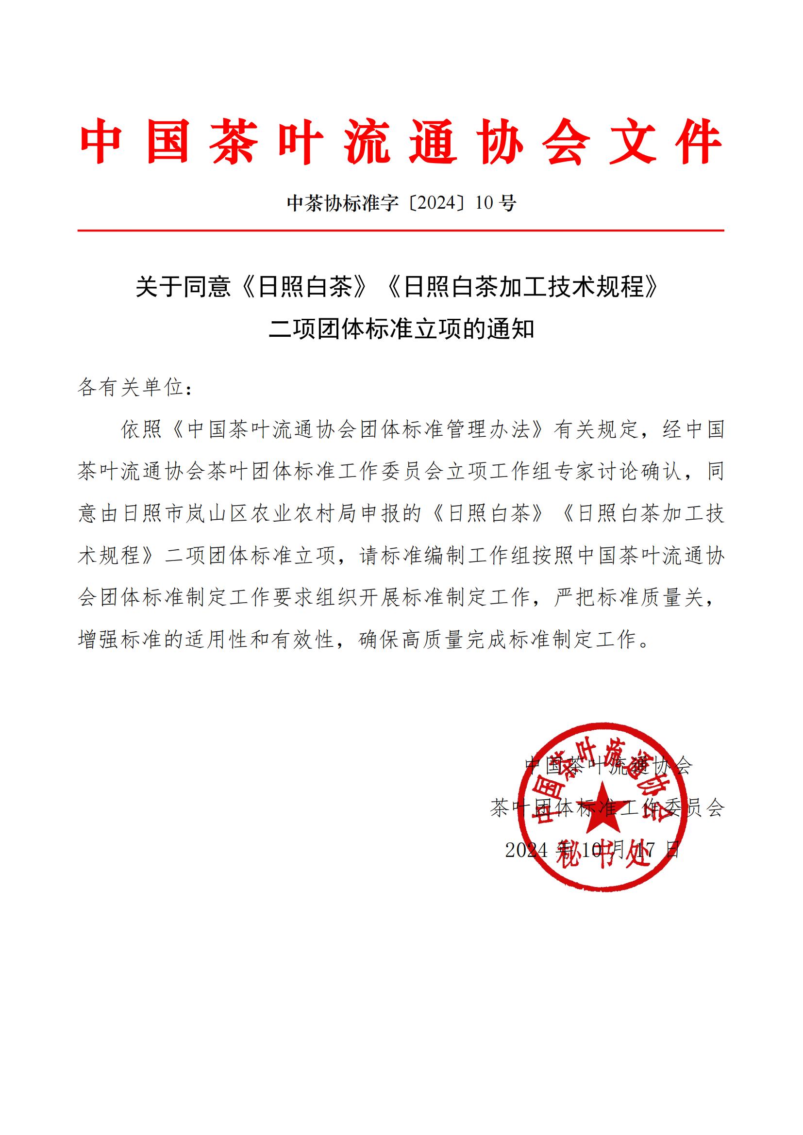 关于同意《日照白茶》《日照白茶加工技术规程》 二项团体标准立项的通知