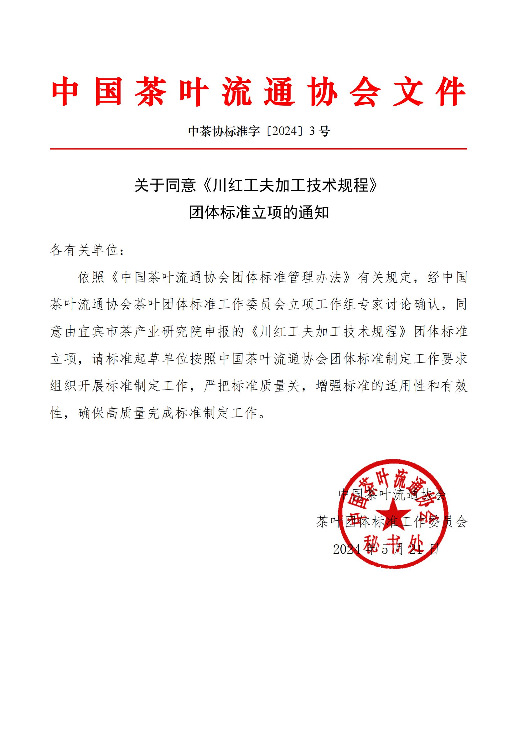 关于同意《川红工夫加工技术规程》团体标准立项的通知