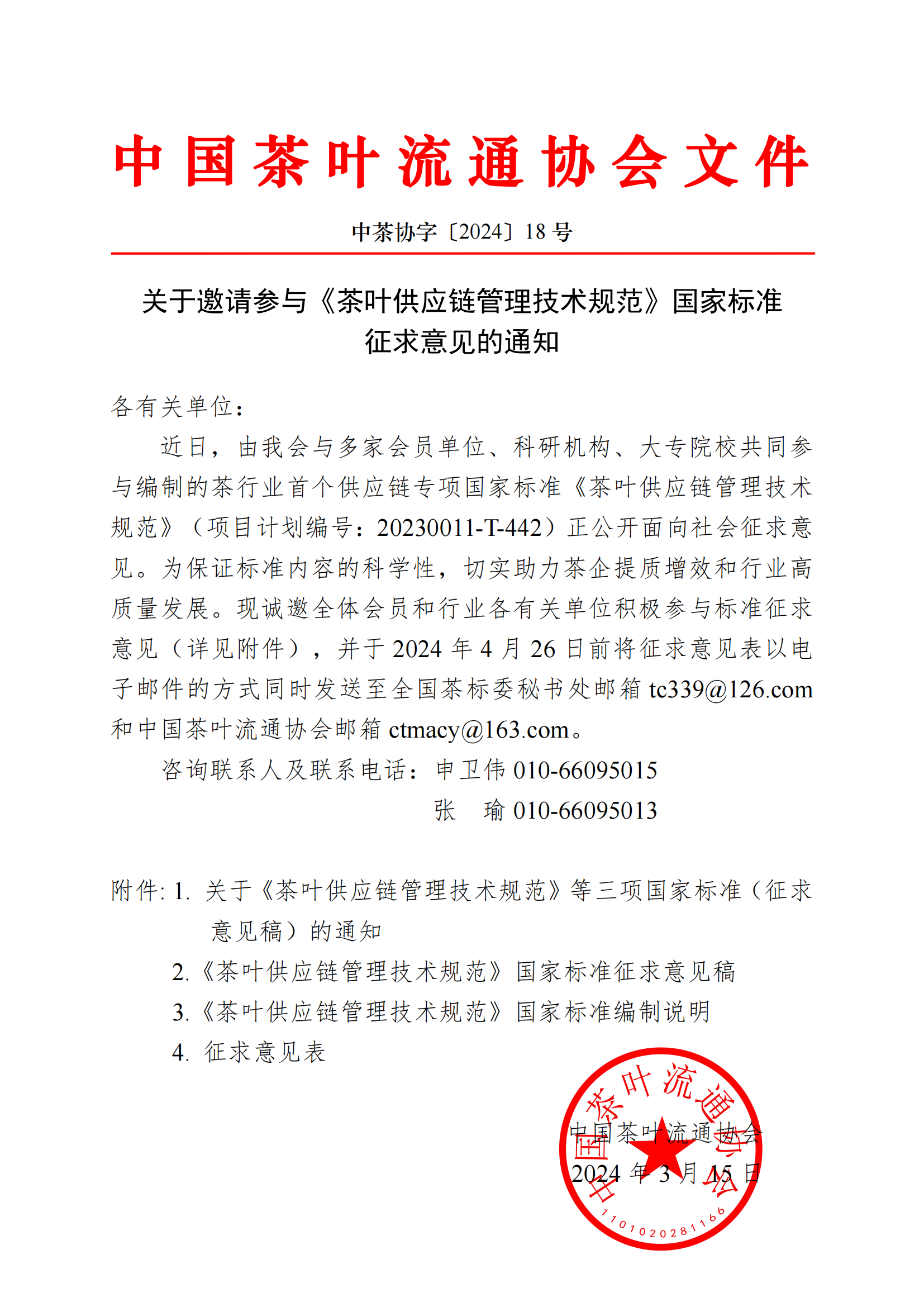 关于邀请参与《茶叶供应链管理技术规范》国家标准征求意见的通知