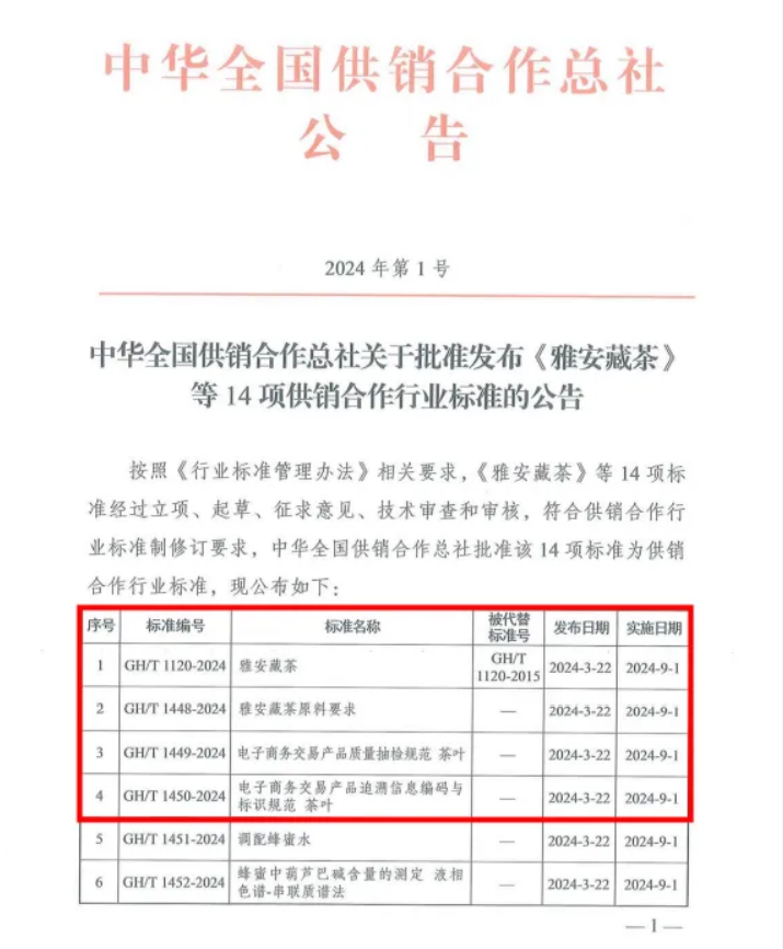 近日,中华全国供销合作总社发布公告(2024年第1号),由中国茶叶流通协会牵头编制的《GH/T 1120-2024雅安藏茶》《GH/T 1448-2024雅安藏茶原料要求》《GH/T 1449-2024电子商务交易产品质量抽检规范茶叶》《GH/T 1450-2024电子商务交易产品追溯信息编码与标识规范茶叶》四项供销合作行业标准正式获批发布。标准发布日期为2024年3月22日,2024年9月1日起实施。