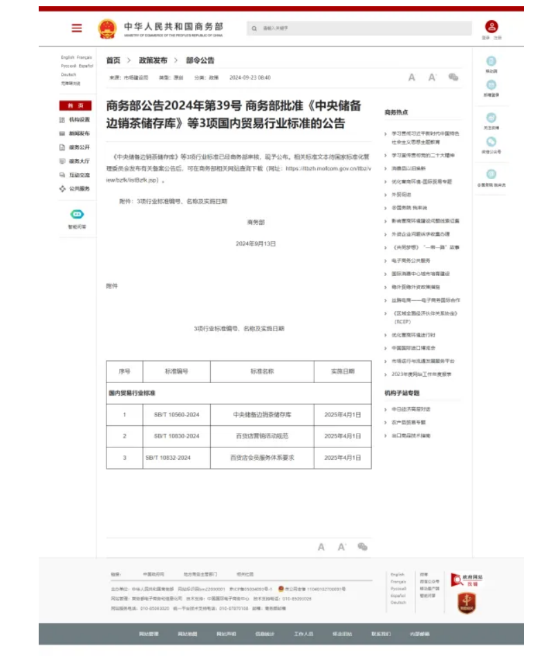 近日,由商务部市场运行与消费促进司指导,中国茶叶流通协会修订的《SBT 10560-2024 中央储备边销茶储存库》行业标准已通过终审并在商务部网站正式公布。该标准将于2025年4月1日起正式实施。