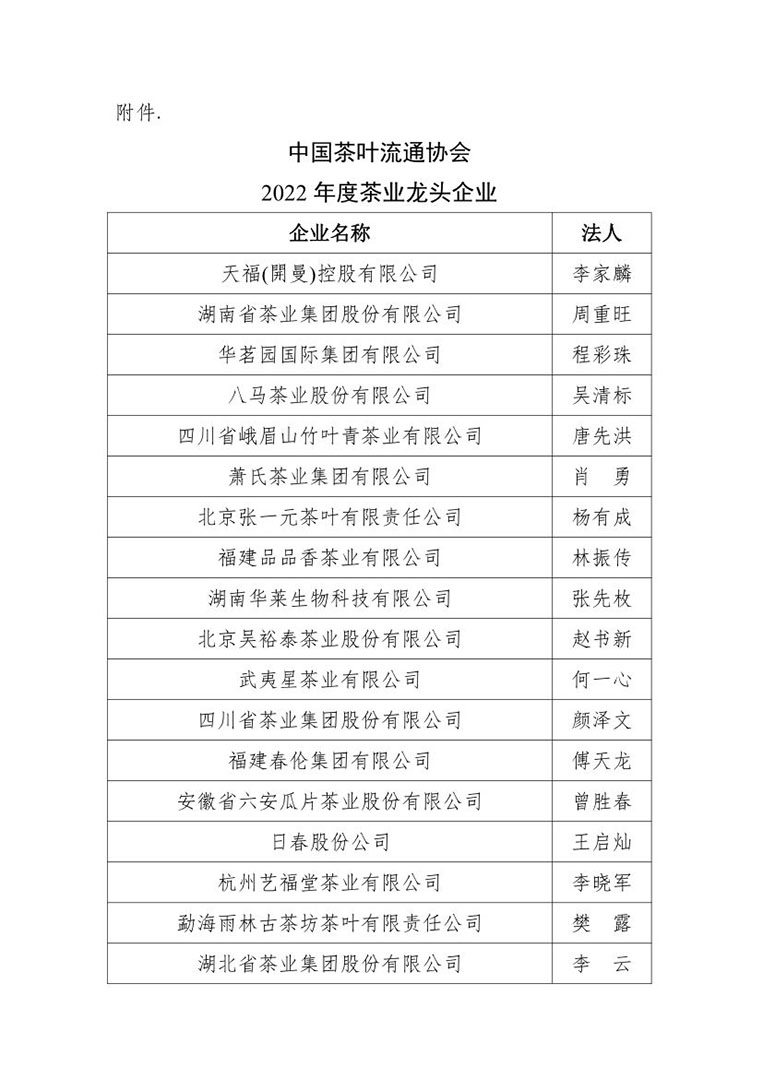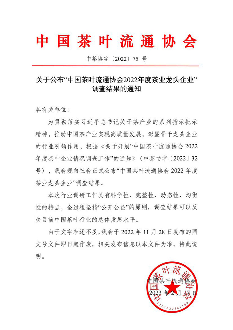 关于公布“中国茶叶流通协会2022年度茶业龙头企业”调查结果的通知