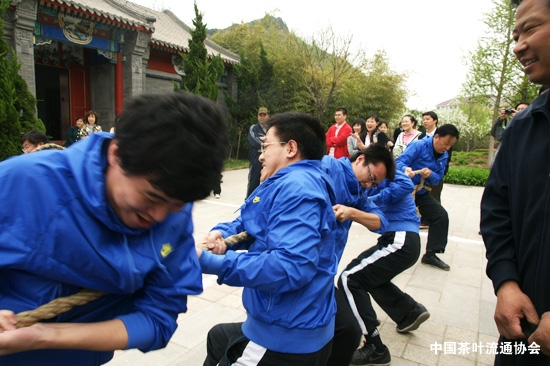 4月18日,为了以实际行动迎接“五·一”国际劳动节的到来,总社直属机关工会组织举办了“我运动 我快乐”的登山活动,并组织总社广大直属机关职工进行“健康杯”拔河比赛。中国茶叶流通协会在常务副会长王庆的带领下,以饱满的姿态积极参加登山活动,以昂扬、坚韧的斗志在八支拔河参赛队伍中勇夺季军。