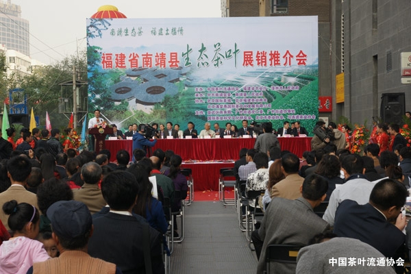 开幕式上,中国茶叶流通协会常务副会长王庆、漳州市委常委统战部长游婉玲、北京市宣武区政府常务副区长杜灵欣、南靖县委书记陈忠厚在会上分别作了热情洋溢的讲话,第十届全国政协副主席张思卿宣布“福建土楼·故里南靖生态茶北京展销推介会开幕”,张思卿、郑义正、潘建新、王庆、杜灵欣、姜绍丰、游婉玲、林晓峰、庄振生、陈忠厚等国家、省市有关领导和嘉宾共同启动“福建土楼·故里南靖生态茶北京展销推介会”开幕仪式。中央电视台七套节目主持人陆梅向来宾现场推介南靖生态茶,南靖县土楼管委会负责人推介福建土楼·故里南靖。