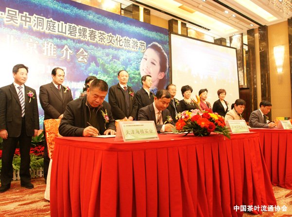 近两个小时的苏州·吴中洞庭山碧螺春茶文化旅游节北京推介会安排得紧密而又丰富。会上,为了方便消费者购买正宗洞庭山碧螺春茶叶,中国茶叶流通协会和苏州吴中区政府启动了洞庭山碧螺春原产地购销网络信息平台,同时主办方还举行对北京及周边地区一批知名茶叶企业授予“洞庭山碧螺春特约经销商”牌的仪式,推介会紧接着还进行现场炒制碧螺春、茶艺表演、旅游推介和各种项目签约仪式。最后,中国茶叶流通协会常务副会长王庆致辞,他说:通过此次活动,一定能够进一步提升“洞庭碧螺春茶”的品牌知名度,培育碧螺春茶产业的发展潜力,促进苏州吴中茶叶产业发展,为更好地落实2010年中央一号文件关于强农惠农的有关政策,推动全国性与区域性茶产业的协调可持续发展做出新的贡献!