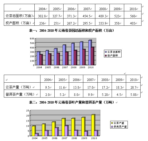 根据云南省农业厅提供的数据:2010年,云南全省茶园面积达560万亩,比2009年的534万亩增加26万亩,增幅为4.87%;投产面积达到403万亩,同比增加45万亩,增幅为12.57%;茶叶总产量为20.73万吨,同比增加2.43万吨,增幅为13.29%。普洱茶产量为5.08万吨,增幅为12.9%。分析表明,2010年虽然云南茶园总面积在连年增加后放缓,但投产茶园的增幅却保持在两位数的水平,2010年云南省投产茶园占茶园总种植面积的71.97%。近几年,新增的茶园陆续进入投产期,使得云南省茶叶总产量以两位数的增幅快速增长。但云南茶叶单产不高,按投产面积计算,2010年云南省的单产是51.4公斤/亩,全国平均单产是62.5公斤/亩,总体效益还有待于提高。