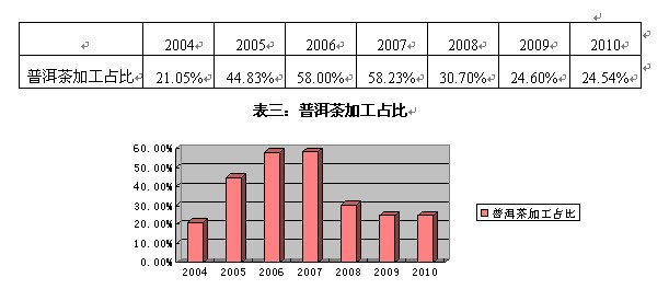 在2007年之前,由于普洱茶市场快速上涨,导致社会资金大量涌入普洱茶,加工能力明显提升。目前云南普洱茶产能估计接近8万吨,年加工能力在200吨以上的加工企业接近100家,2010年实际加工量为5.08万吨,目前普洱茶产能还处于相对过剩状况。