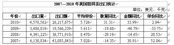 除了国内消费外,普洱茶在港、台地区以及东南亚、欧洲有着广泛的市场,消费基础较好。在经过连续几年下降之后,普洱茶出口于2010年得到较大增长。据海关统计,2010年普洱茶共出口4578吨,出口金额为2621万美元,分别比上年增长了31.31%和33.99%。出口单价为5.72美元,比上年同期上涨了2.04%。