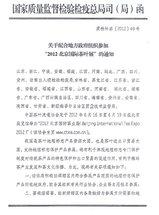 国家质量监督检验检疫总司(局)发文邀请地方政府组团参加2012北京国际茶业展