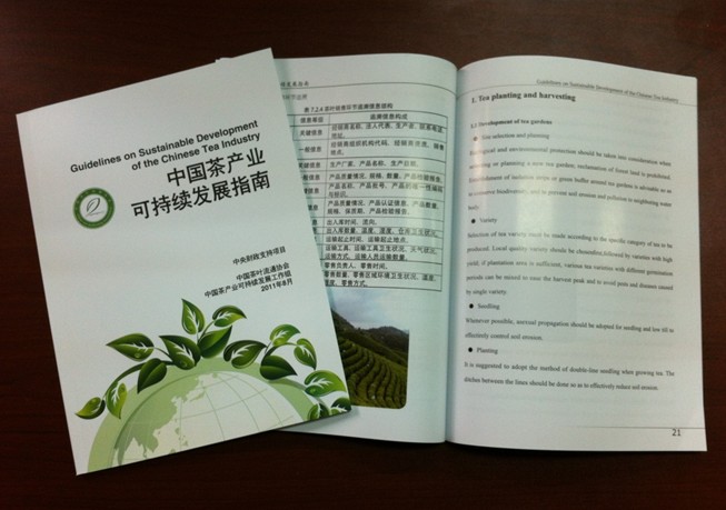 在中央财政支持下, 2012年3月,中国茶叶流通协会组织编撰的《中国茶产业可持续发展指南》正式出版发行。本《指南》从茶叶种植与采摘、茶叶生产/加工过程控制、茶叶的包装、仓储、运输过程控制、茶叶质量安全追溯系统、环境友好和社会责任等六个方面阐述了中国茶叶可持续发展的基本方针、具体内涵和工作方向,并希望籍此《指南》为中国的茶叶生产者提供改善其可持续发展能力的参考框架