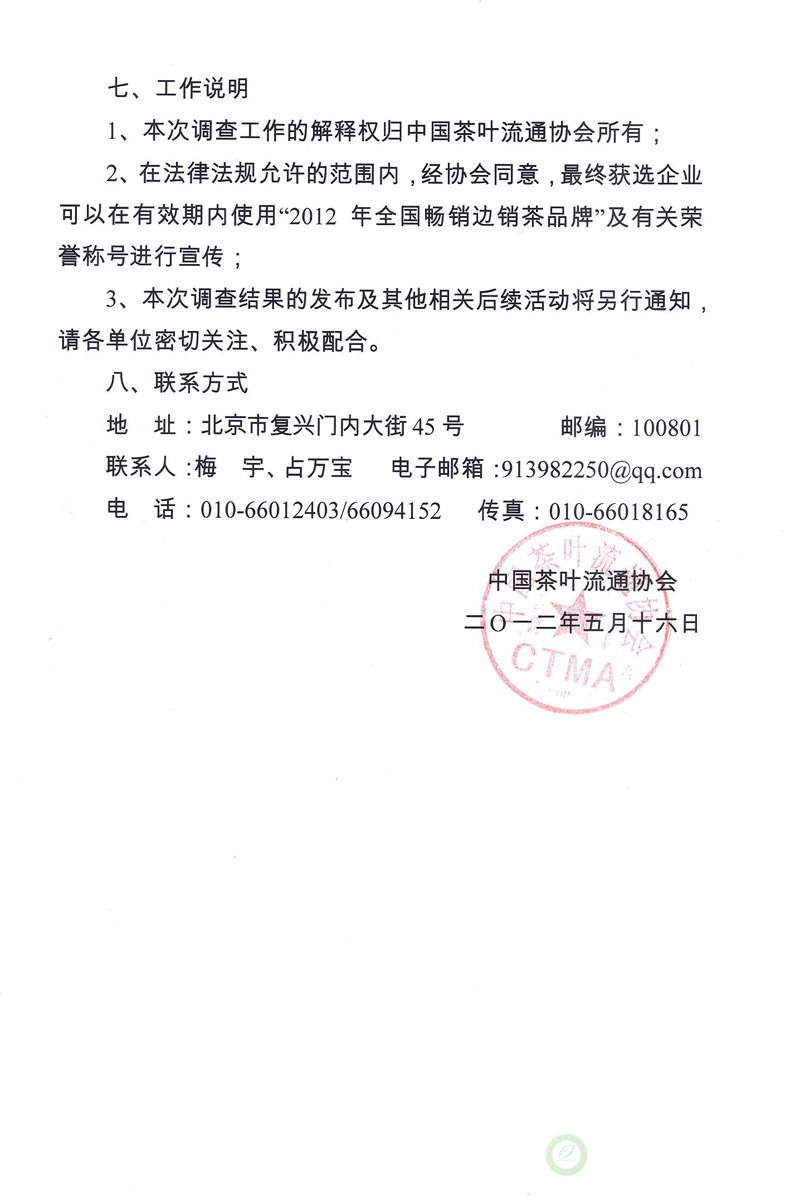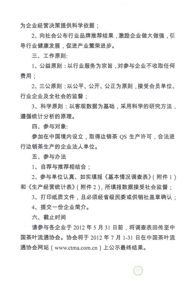 请参与各企业于2012年5月31日前,将调查表回传至中国茶叶流通协会。协会将于2012年7月1-31日在中国茶叶流通协会网站(www.ctma.com.cn)上公示最终结果。