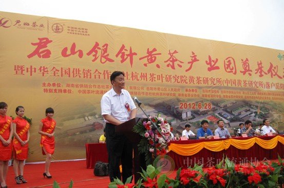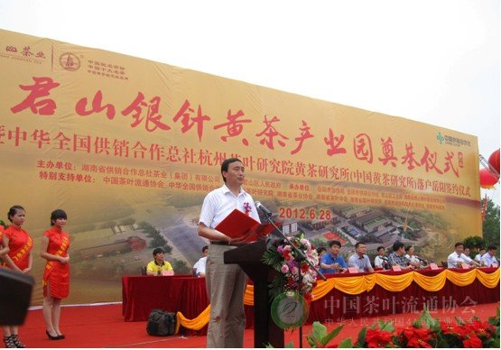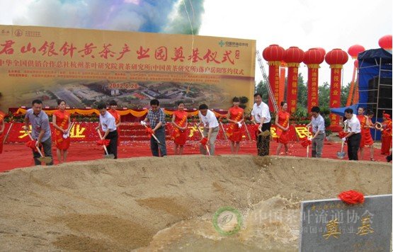 6月28日,“君山银针黄茶产业园奠基仪式”在湖南省岳阳市举行。湖南省副省长徐明华、中国茶叶流通协会常务副会长王庆出席仪式并讲话。湖南省人民政府副秘书长陈吉芳、湖南省供销合作总社党组书记曾震亚、岳阳市委副书记市长盛荣华等湖南省、岳阳市、君山区各级领导以及中华全国供销合作总社杭州茶叶研究院等院所的专家出席仪式,湖南省供销合作总社理事会主任陈德礼主持仪式。