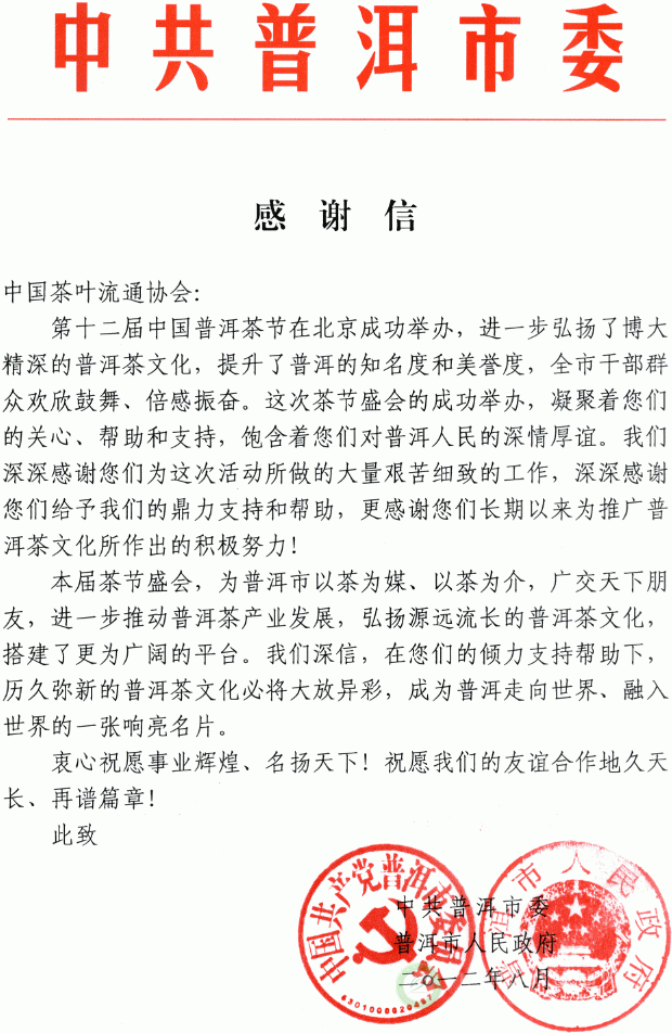 ——中共普洱市委、市政府就“一会二节”活动向我会发信致谢