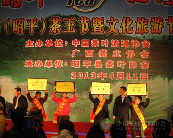 2013年4月11日,由中国茶叶流通协会、广西茶业协会主办,昭平县茶叶协会承办的“2013广西(昭平)茶王节暨文化旅游节”隆重召开。中国茶叶流通协会常务副会长王庆出席开幕晚会,致辞并代表主办单位向获得茶王的有关企业颁奖。