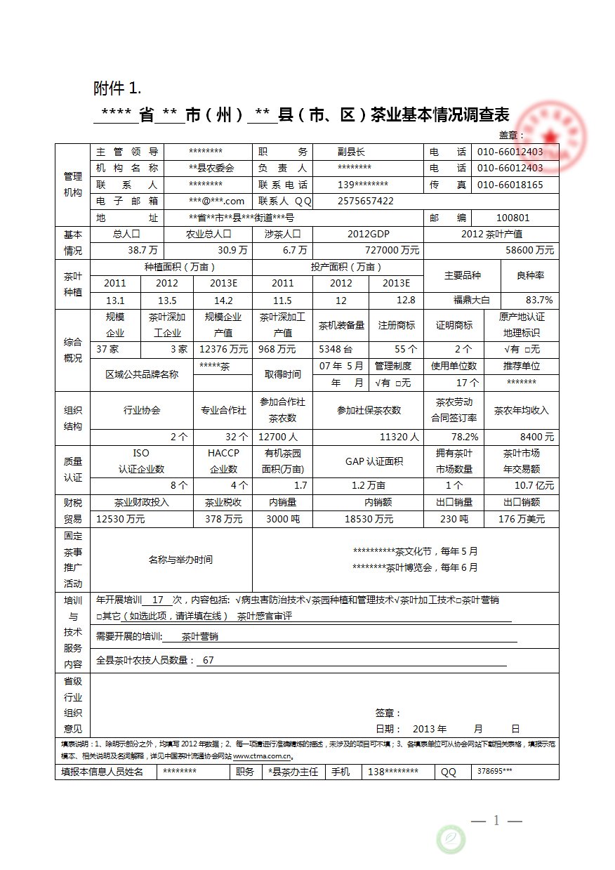 参与本次调查的县级政府将获得“2013年全国重点产茶县”称号及有关荣誉,并获赠《2013中国茶叶行业发展报告》。现将有关调查事项通知如下: