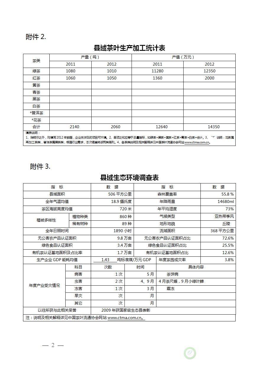 (3)拟申报2013年全国生态产茶县的调查对象,需同时提交生态产茶县申报材料,文字材料不得少于1500字。
