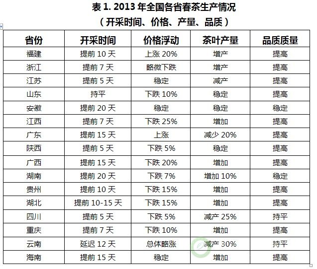 此外,全国其它产茶区春茶进行都比较顺利,如江苏、湖北、陕西、海南、广东、重庆等均反映生产正常,产量会有所增加或持平。