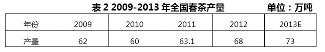 1、茶叶产量再创新高。过去几年,我国春茶的生产和采摘一直受气候波动影响,但产量依旧保持年均10%左右的递增,主要因素是新开辟茶园和存量茶园基数较大,弥补了减产部分。2013年天气良好,大部分省份反映本省区增产几成定局。据此推算2013年总产量将达到185万吨。