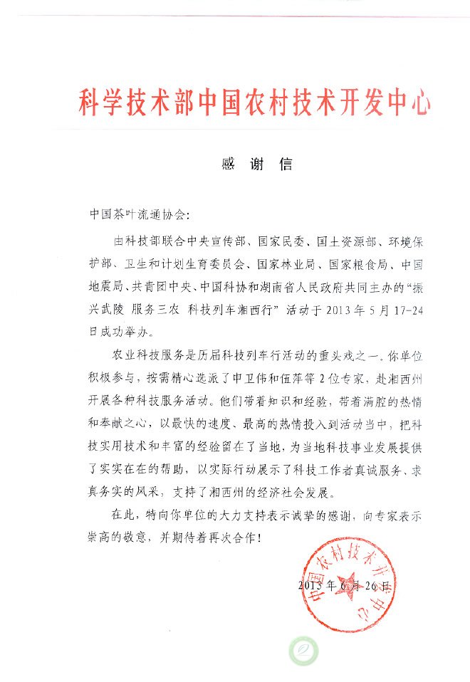 7月2日,国家科技部中国农村技术开发中心专程致函中茶协,对于我会派员参加“振兴武陵服务三农科技列车湘西行”活动表示感谢,对我会派出人员在本次活动中的表现给予肯定和表扬。同时,国家科技部中国农村技术开发中心表示愿与中茶协建立长期合作机制,共同推动我国农村科技工作和服务三农工作不断发展。
