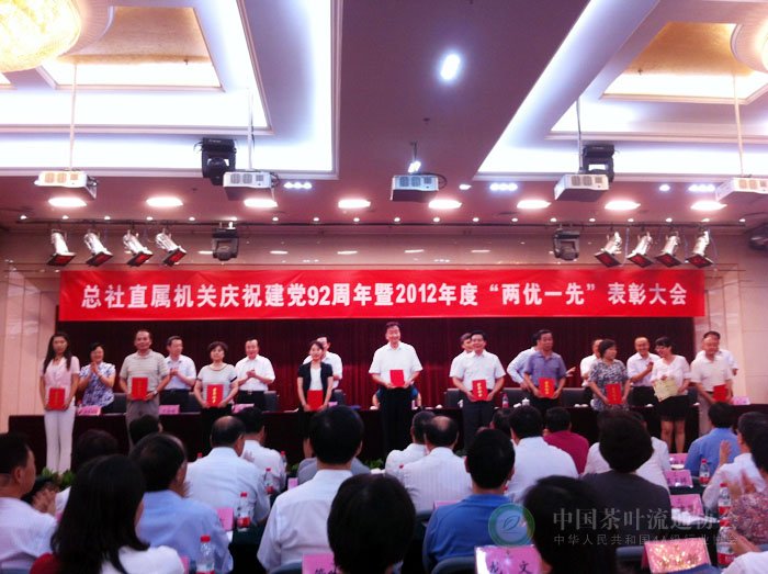 7月1日,在总社直属机关庆祝建党92周年暨2012年度“两优一先”表彰大会上,中共中国茶叶流通协会党支部被授予“2012年度供销总社直属机关先进基层党组织”称号,党支部书记王庆同志被评为“2012年度供销总社直属机关优秀党务工作者”,李佳禾同志被评为“2012年度供销总社直属机关优秀党员”。