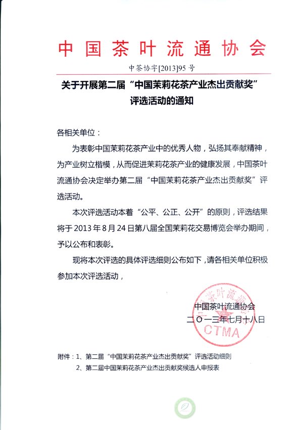 关于开展第二届“中国茉莉花茶十大品牌企业”评选活动的通知