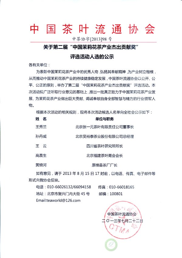 关于第二届“中国茉莉花茶产业杰出贡献奖”评选活动人物的公示