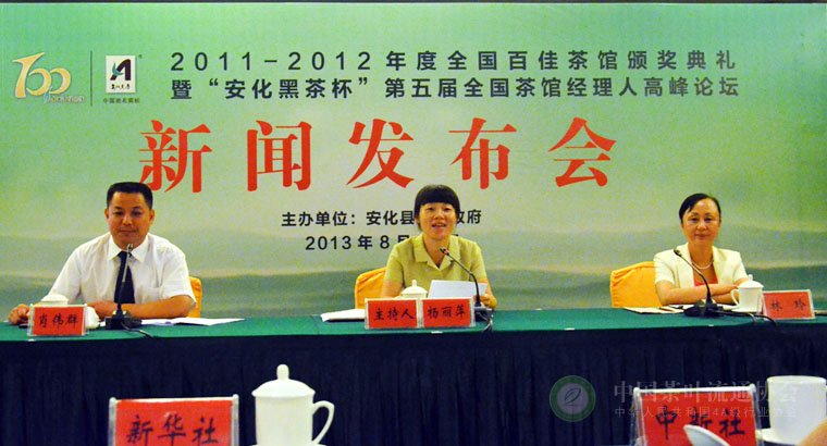 8月15日,安化县人民政府在益阳市佳宁娜国际大酒店举行新闻发布会宣布,由中国茶叶流通协会、中华合作时报社主办,安化县人民政府、中国茶叶流通协会茶馆专委会、中华合作时报•茶周刊承办的2011~2012年度全国百佳茶馆颁奖典礼暨“安化黑茶”杯第五届全国茶馆经理人高峰论坛将于9月4日至7日在湖南省安化县隆重举行。目前,各项准备工作已基本就绪,百万安化人们将热情迎接全国各地茶馆行业的精英的到来。