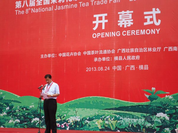 2013年8月24日上午,由中国茶叶流通协会、中国花卉协会、广西壮族自治区林业厅、广西南宁市人民政府共同主办,横县人民政府承办的“第八届全国茉莉花茶交易博览会•2013年中国国际茉莉花文化节”在美丽的茉莉之乡——广西横县隆重开幕。开幕式由南宁市人民政府副市长魏凤君主持,中共南宁市委常委、横县县委书记李振林致欢迎辞,广西壮族自治区林业厅副厅长邓建华、国家质量监督检验检疫总局科技司副巡视员裴晓颖、中国茶叶流通协会常务副会长王庆、中国花卉协会副会长张玉香先后发表了热情洋溢的讲话。