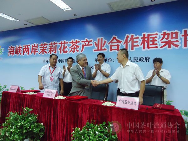 25日上午,在中国茶叶流通协会的主持下,台湾区制茶工业同业公会与广西茶叶协会、广西横县花茶协会举行了《海峡两岸茉莉花茶产业合作框架协议》签约仪式。近年来,在中国茶叶流通协会与台湾区制茶工业同业工会等台湾区茶叶行业社团组织的共同推动下,两岸茶界交往日益频繁,交流互动达到了前所未有的新高。此次签约仪式的举行,更使茉莉花茶再次成为搭建海峡各界人士合作交流、缔结友情、实现双赢的崭新的友谊桥梁。