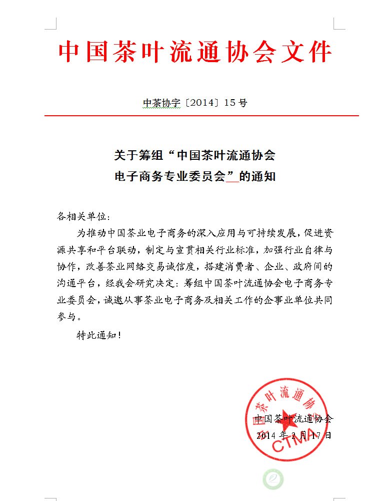 为推动中国茶业电子商务的深入应用与可持续发展,促进资源共享和平台联动,制定与宣贯相关行业标准,加强行业自律与协作,改善茶业网络交易诚信度,搭建消费者、企业、政府间的沟通平台,经我会研究决定:筹组中国茶叶流通协会电子商务专业委员会,诚邀从事茶业电子商务及相关工作的企事业单位共同参与。